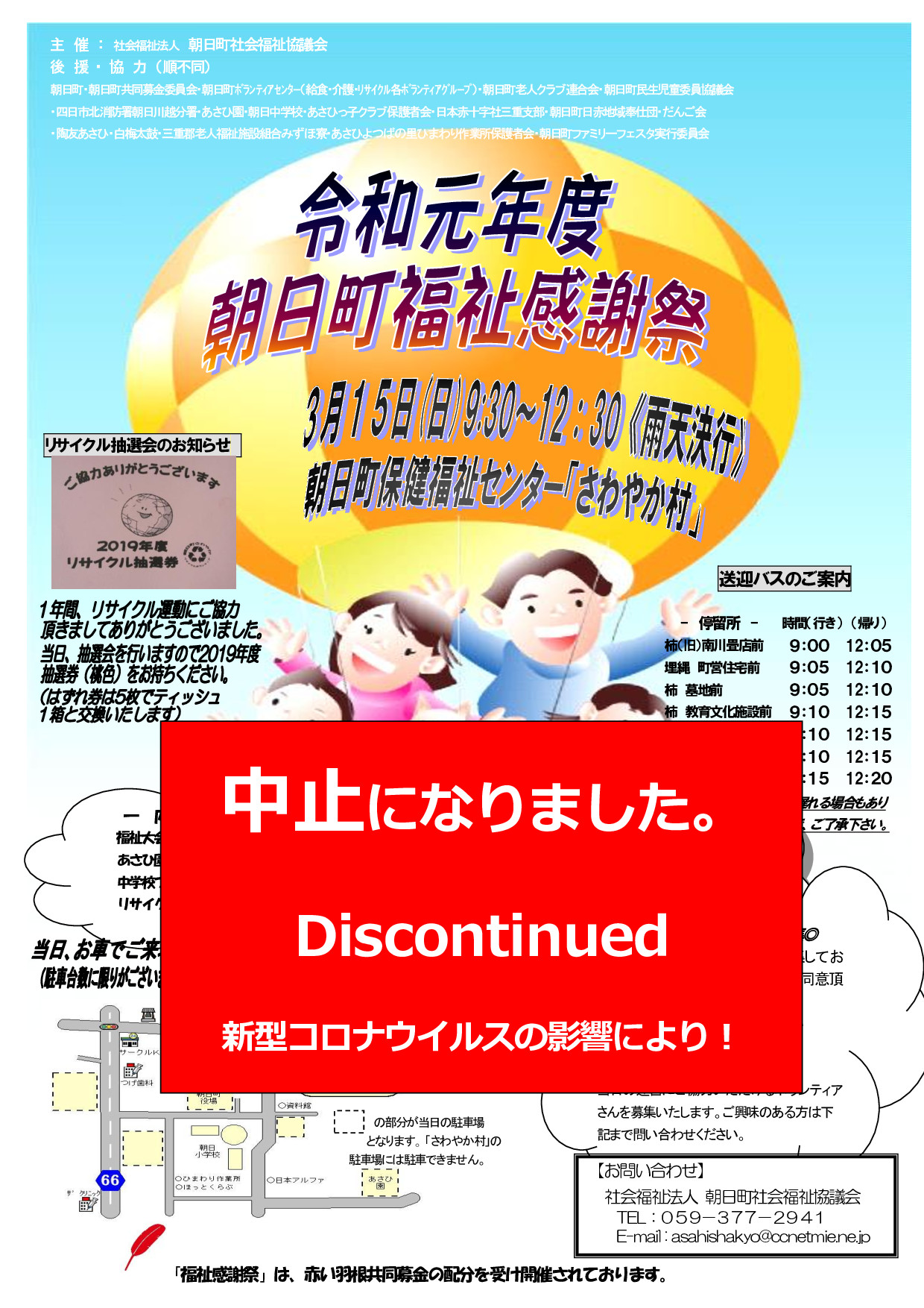 3月15日に開催予定でした令和元年度朝日町福祉感謝祭ですが、新型コロナウイルスの感染拡大の防止という観点から、中止の判断をさせていただきました。
